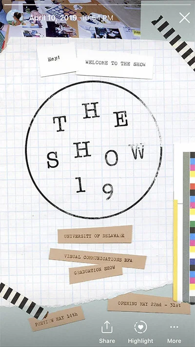 As a member of the branding team for The Show 2019, the University of Delaware Visual Communications BFA exhibition, I worked together with my classmates to develop the concept and messaging for our senior showcase. We determined our most valuable lesson was in trusting the process. The branding team was responsible for ensuring this translated consistently across the event setup and visuals. Among the graphics I created are Facebook profile banners and an Instagram slideshow post.